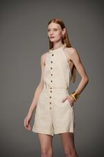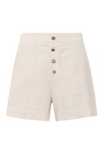 Bermuda mom feminina Patogê em tecido de alfaiataria natural conferindo sofisticação a peça. Bolsos frontais estilo faca, bolsos posteriores, detalhe de abotoamento não funcional de formas orgânicas. Fechamento lateral por zíper invisível. Peça amaciada em processos de lavanderia. Peças da mesma família: BL39645 e CL39689. A modelo da foto veste tamanho 38. Medidas da modelo: Altura 1,74m Busto 88cm Cintura 65cm Quadril 99cm