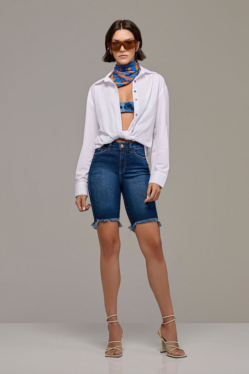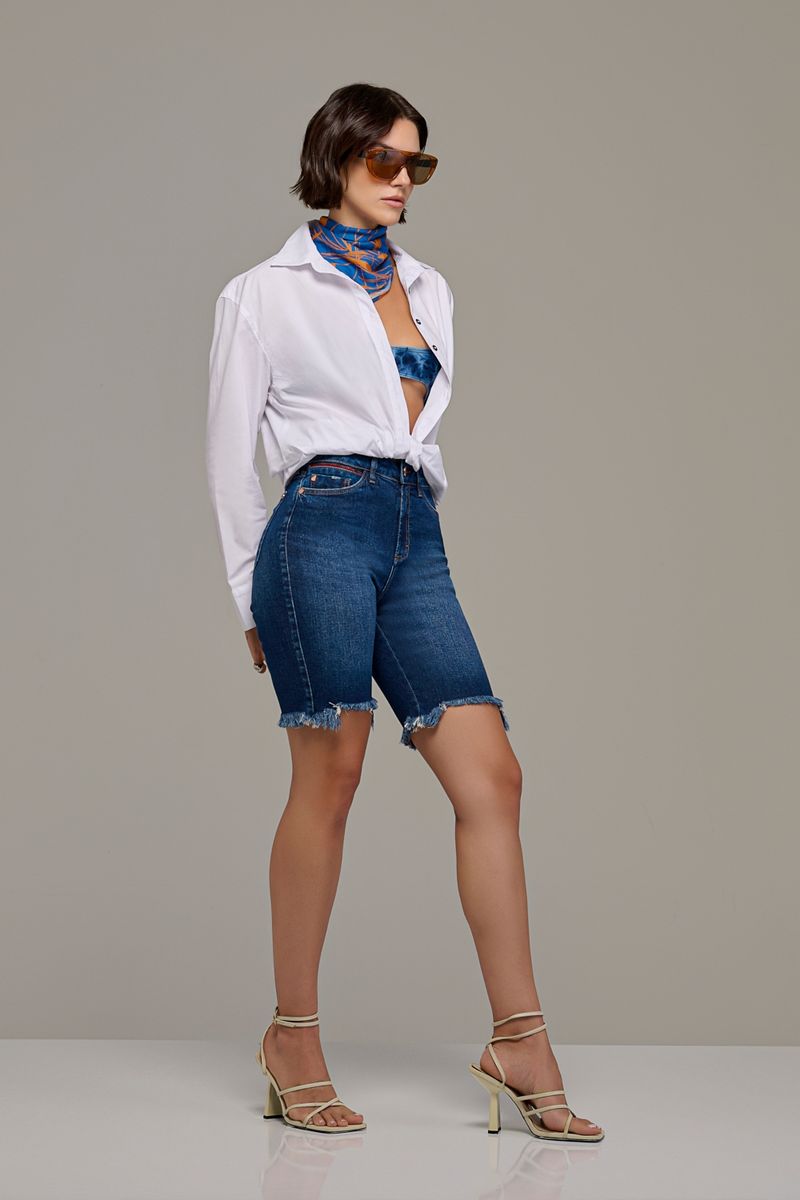Bermuda ciclista feminina Patogê em jeans de algodão e elastano proporcionando conforto durante o uso. Detalhe com zíper vermelho no cós, bolsos posteriores, cós com passantes e fechamento por zíper e botão. Lavanderia média com marcação de costura.