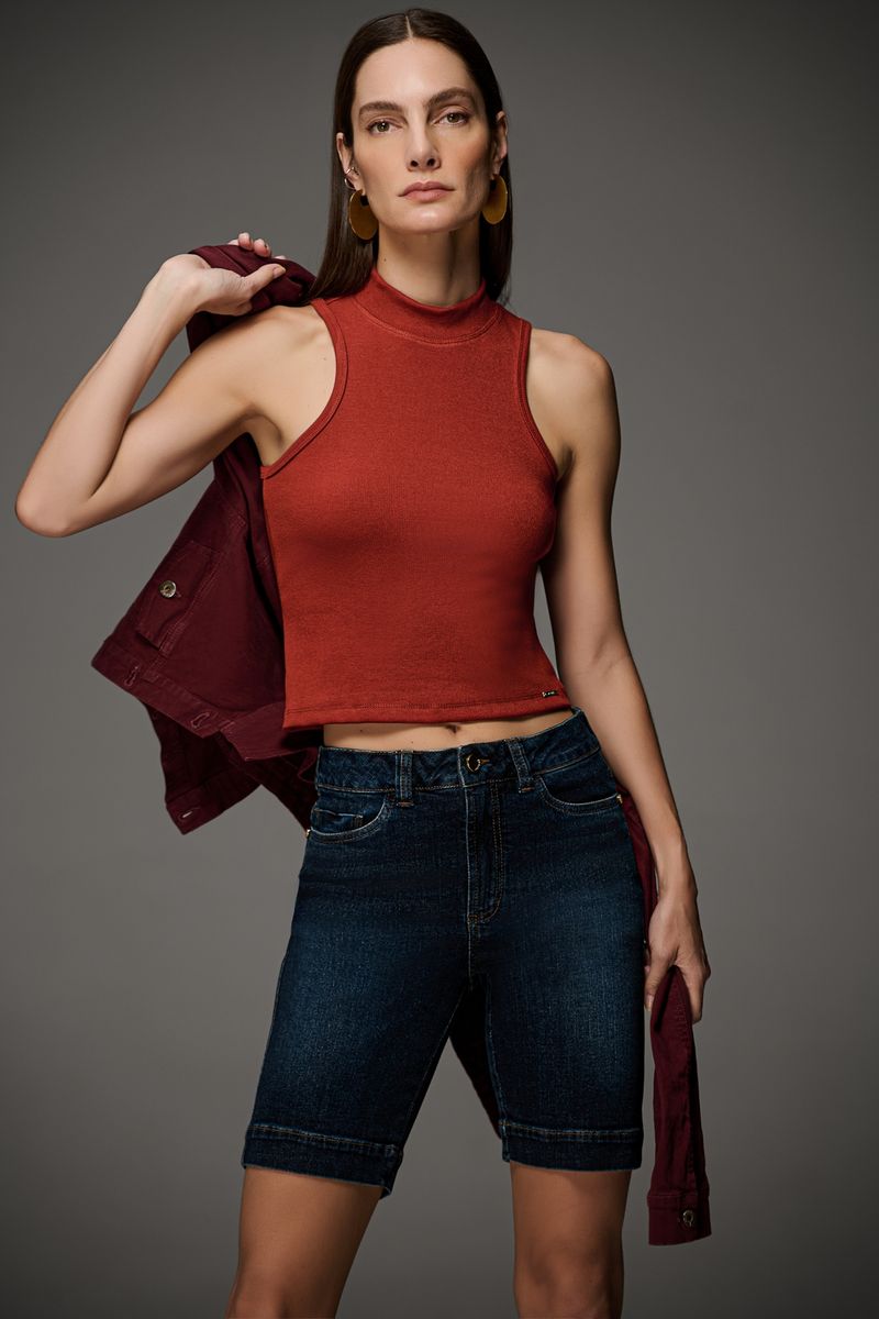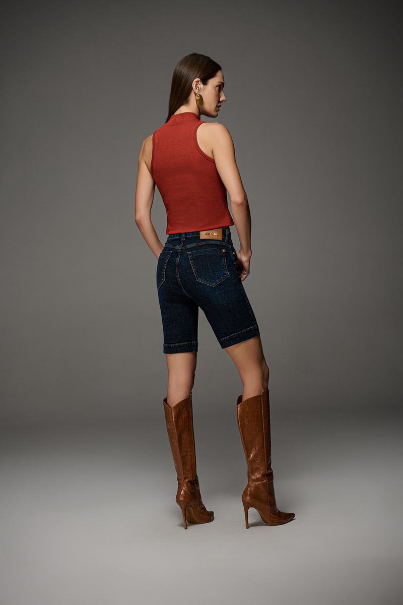 Bermuda ciclista feminina Patogê em jeans de algodão com elastano proporcionando conforto durante o uso. Peça versátil com detalhe de pespontos laterais, bolsos frontais tradicionais, bolsos posteriores, cós com passantes e fechamento por zíper e botão. Lavanderia escura marmorizada com marcação de costura. A modelo da foto veste tamanho 38. Medidas da modelo: Altura 1,74m Busto 88cm Cintura 65cm Quadril 99cm