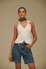 Bermuda jorts feminina Patogê em jeans 100% algodão. Detalhe removível no cós de corrente e metal personalizado da marca. Bolsos frontais, bolsos posteriores com tampa, barra larga e fechamento por zíper e botão. Lavanderia média para escura stonada com marcação de costura.