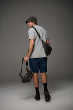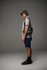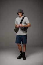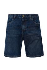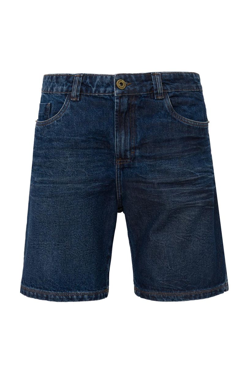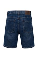 Bermuda masculina Patogê em jeans 100% algodão. Bolsos frontais tradicionais, bolsos posteriores, cós com passantes e fechamento por zíper e botão. Lavanderia média para escura marmorizada com marcação de costura.