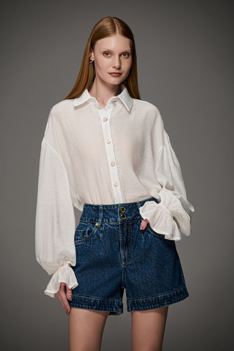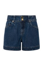 Bermuda new boyfriend feminina Patogê em jeans 100% algodão. Peça versátil com bolsos frontais tradicionais, bolsos posteriores, cós largo com passantes e fechamento por zíper e botões de pressão. Lavanderia escura marmorizada com marcação de costura. A modelo da foto veste tamanho 38. Medidas da modelo: Altura 1,74m Busto 88cm Cintura 65cm Quadril 99cm
