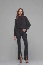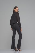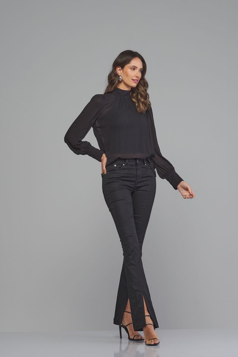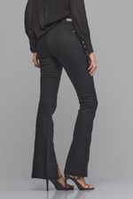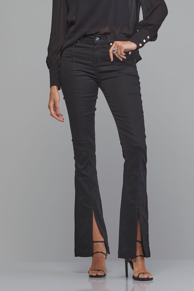 Calça Patogê feminina boot cut cintura média (G3) em jeans de algodão, poliéster e elastano, proporcionando conforto durante o uso. Recorte na parte frontal com fendas nas barras, bolsos posteriores, cós com passantes e fechamento frontal por zíper e botão.