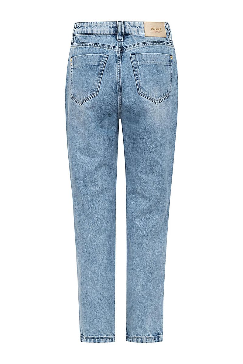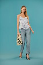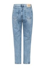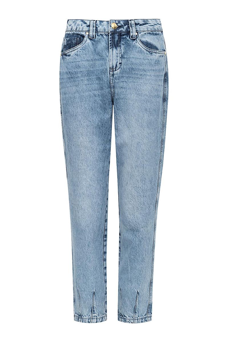 Calça baggy feminina Patogê em jeans 100% algodão. Bolsos frontais, bolsos posteriores, pences nas barras, cós com passantes e fechamento por zíper e botão. Lavanderia média marmorizada com marcação de costura.
