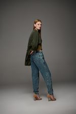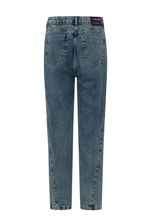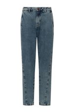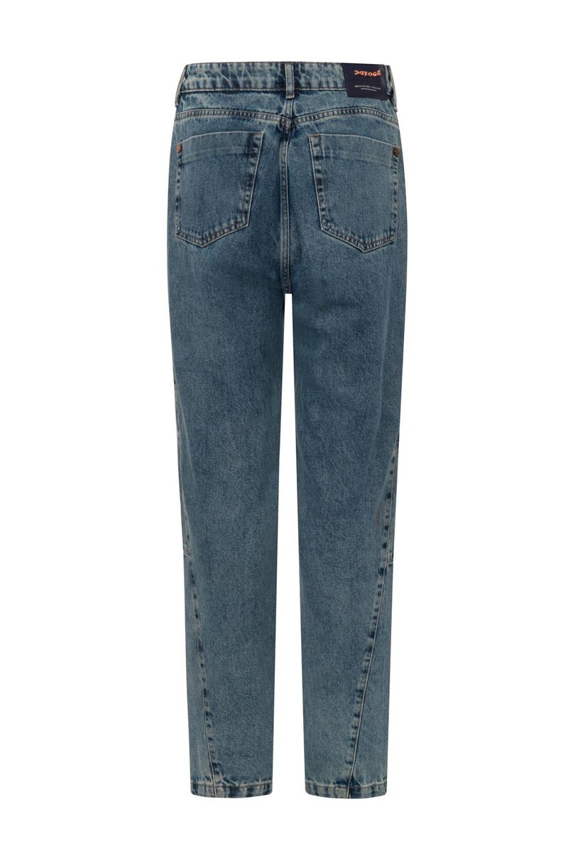 Calça baggy feminina Patogê em jeans 100% algodão. Modelo despojado e moderno com recortes frontais evidenciando ainda mais as marcações no tecido após a lavagem. Bolsos frontais estilo faca, bolsos posteriores, cós com passantes e fechamento por zíper e botão. Lavanderia média marmorizada com marcação de costura.