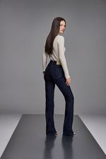 Calça Patogê feminina boot cut cintura alta (G4) em jeans com elastano, proporcionando maior conforto durante o uso. Barra à fio, bolsos posteriores, cós com passantes e fechamento frontal por zíper e botão. Lavanderia média com marcação de costura.