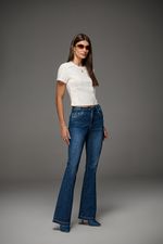 Calça flare G3 feminina Patogê em jeans de algodão com elastano proporcionando conforto durante o uso. Detalhe no cós com aleta pespostanda, abotoamento de pressão e fivela fixa exclusiva da marca. Bolsos frontais tradicionais, bolsos posteriores, barra desfeita e fechamento por zíper e abotoamento interno. Lavanderia média marmorizada com marcação de costura.
