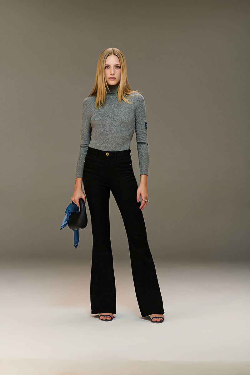 Calça flare (G4) cintura alta feminina Patogê em algodão e elastano proporcionando contorno durante o uso. Bolsos frontais, bolsos posteriores, cós com passantes e fechamento frontal por zíper e botão.