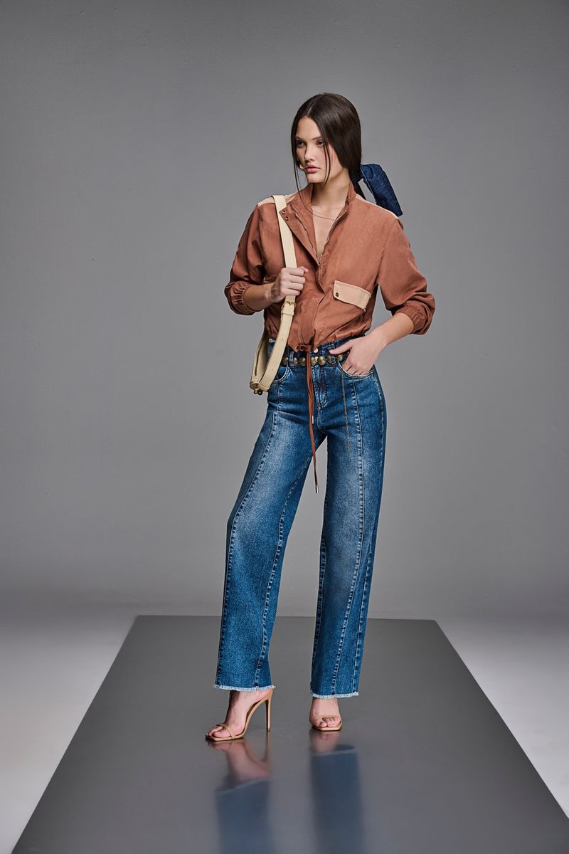 Calça reta G4 feminina Patogê em jeans de algodão com elastano proporcionando conforto durante o uso. Detalhe de recortes frontais, bolsos posteriores, cós embutido à fio, barras a fio e fechamento frontal por zíper e botões de pressão. Acompanha cinto. Lavanderia média com marcação de costura.