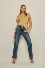 Calça reta feminina Patogê em jeans de algodão com elastano proporcionando conforto durante o uso. Bolso relógio com detalhe em jeans resinado, bolsos posteriores, cós com pespontos duplos e passantes. Fechamento por zíper e botão. Lavanderia média para escura stonada com marcação de costura.