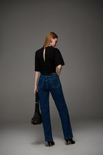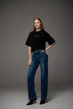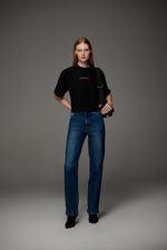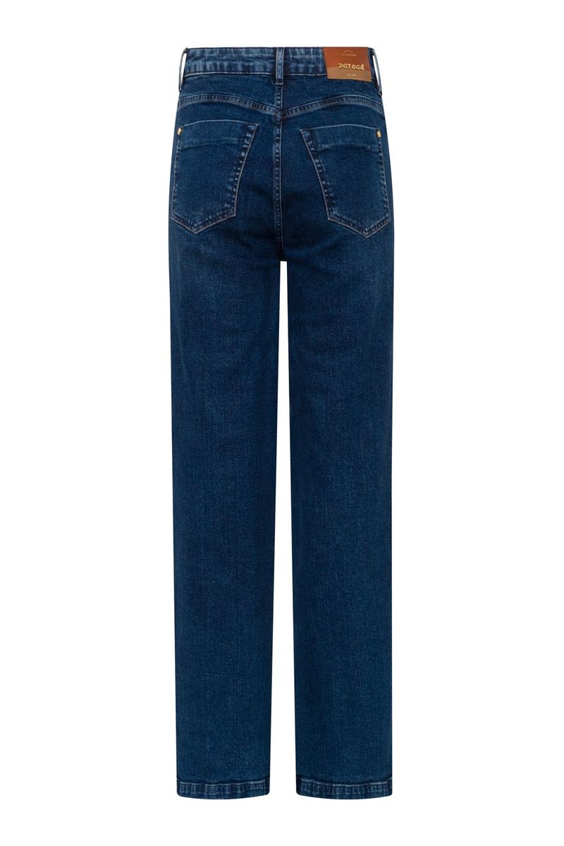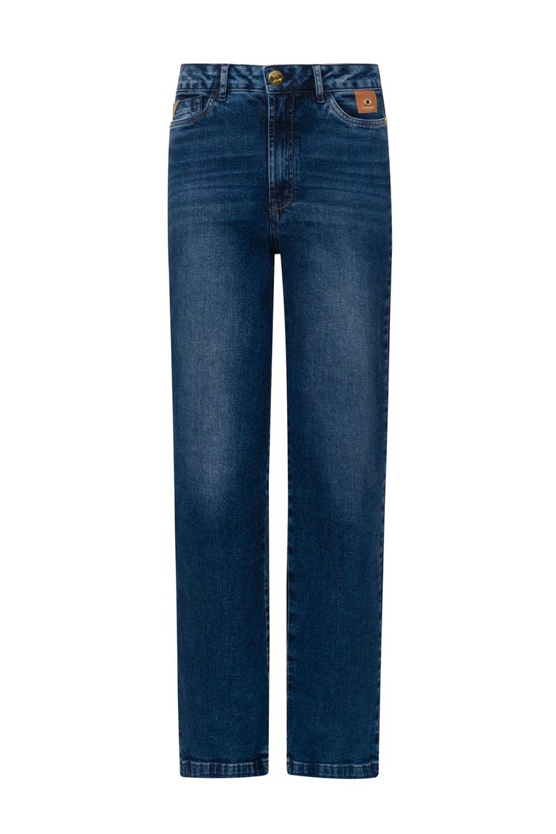 Calça reta feminina Patogê em jeans de algodão com elastano proporcionando conforto durante o uso. Modelagem tendência da temporada com detalhe em etiqueta frontal e cantoneira personalizada exclusivos da marca. Bolsos tradicionais, bolsos posteriores, cós com passantes e fechamento por zíper e botão. Lavanderia média marmorizada com marcação de costura. A modelo da foto veste tamanho 38. Medidas da modelo: Altura 1,74m Busto 88cm Cintura 65cm Quadril 99cm