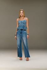 Calça reta over G4 feminina Patogê em jeans 100% algodão. Bolsos frontais, bolsos posteriores, barra a fio, cós com passantes e fechamento por zíper e botão. Lavandeira média marmorizada com detalhes destroyed.