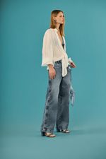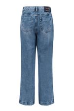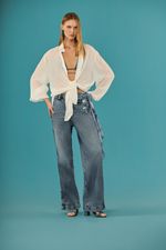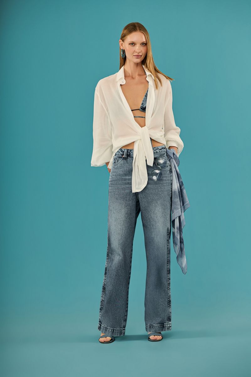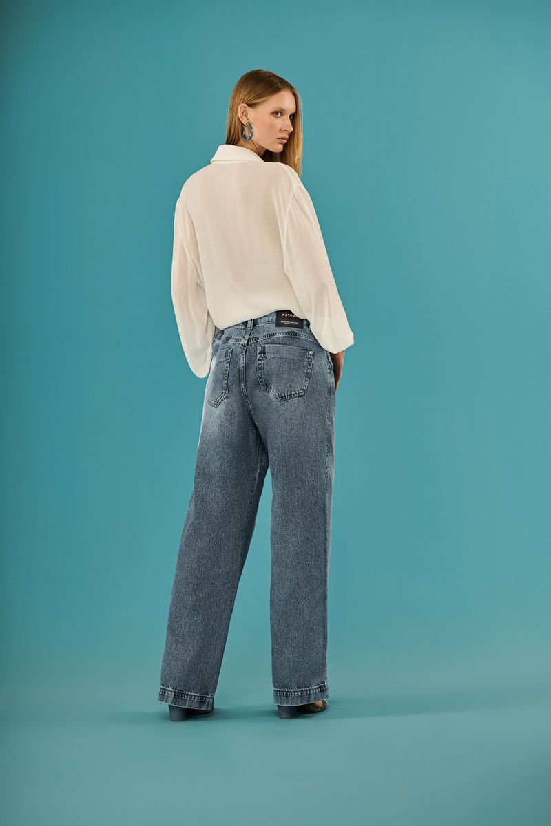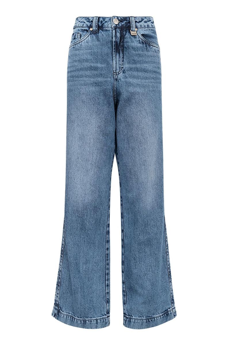 Calça reta over feminina Patogê em jeans 100% algodão. Forte aposta da temporada com detalhe lateral em vivo do próprio tecido, bolsos frontais, bolsos posteriores, cós com passantes e pingente exclusivo da marca. Fechamento por zíper e botão. Lavanderia média para clara marmorizada com marcação de costura.