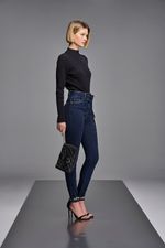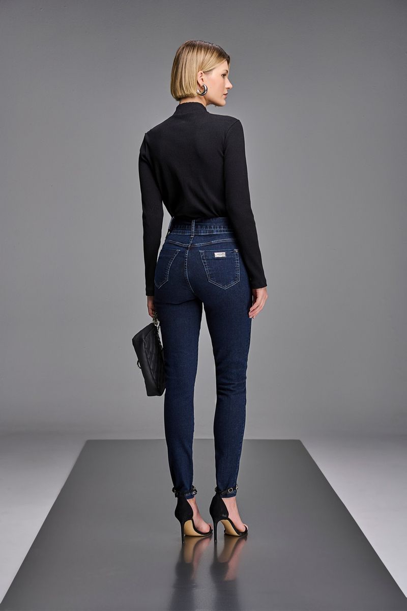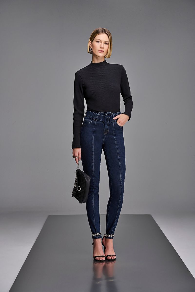 Calça skinny G4 feminina Patogê em jeans de algodão com elastano proporcionando conforto durante o uso. Cinto do próprio tecido com fivela forrada, recorte frontal, bolsos posteriores, cós com passantes e fechamento frontal por zíper e botão.