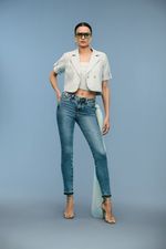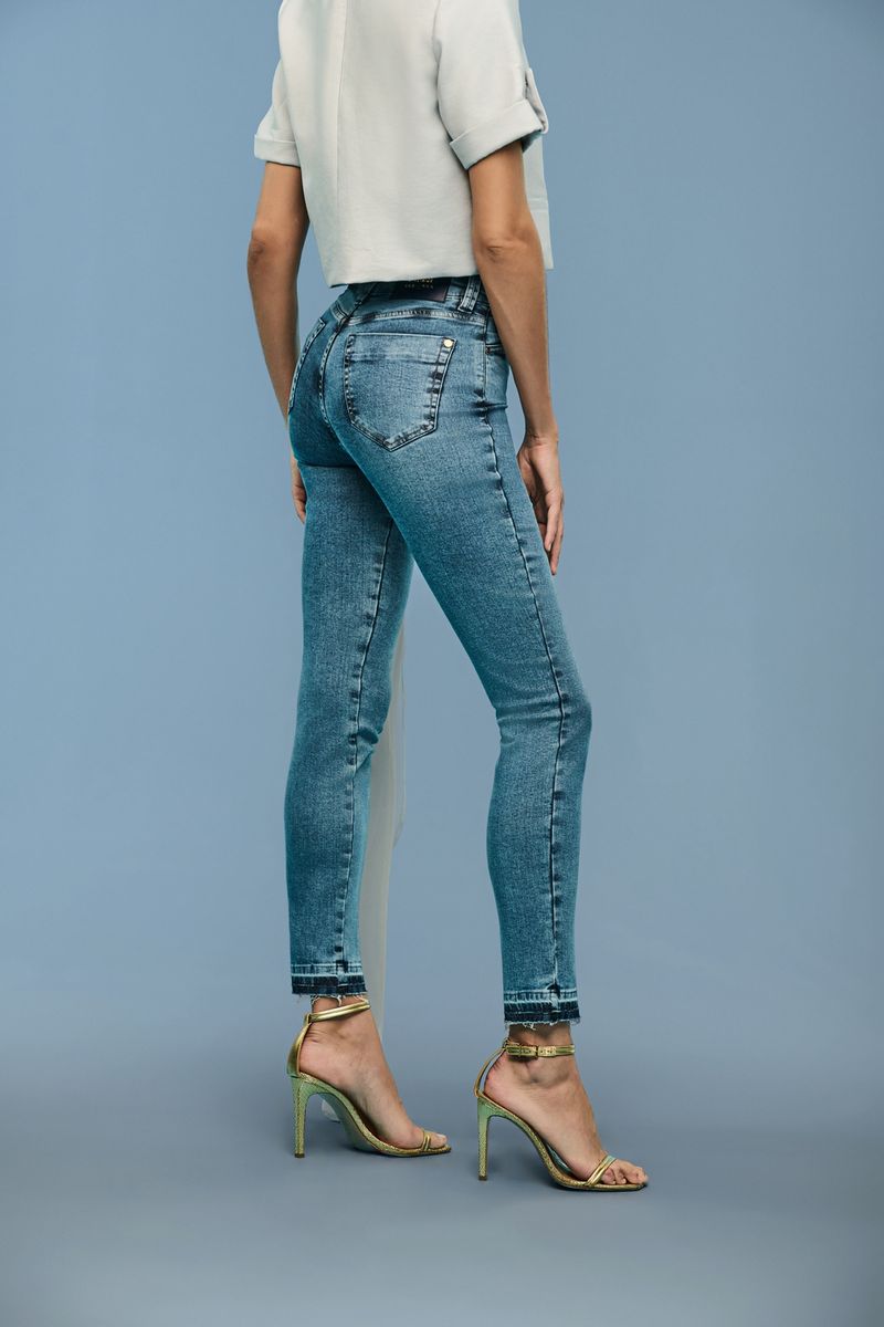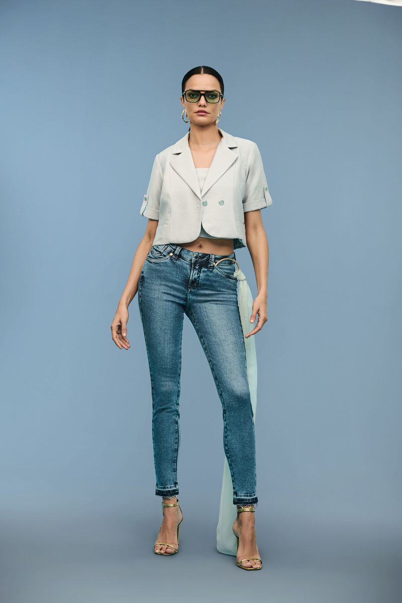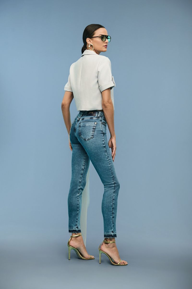 Calça skinny G3 feminina Patogê em jeans de algodão com elastano proporcionando conforto durante o uso. Bolsos relógio deslocado, bolsos frontais, bolsos posteriores, cós com passantes, barras desfeitas após lavanderia
