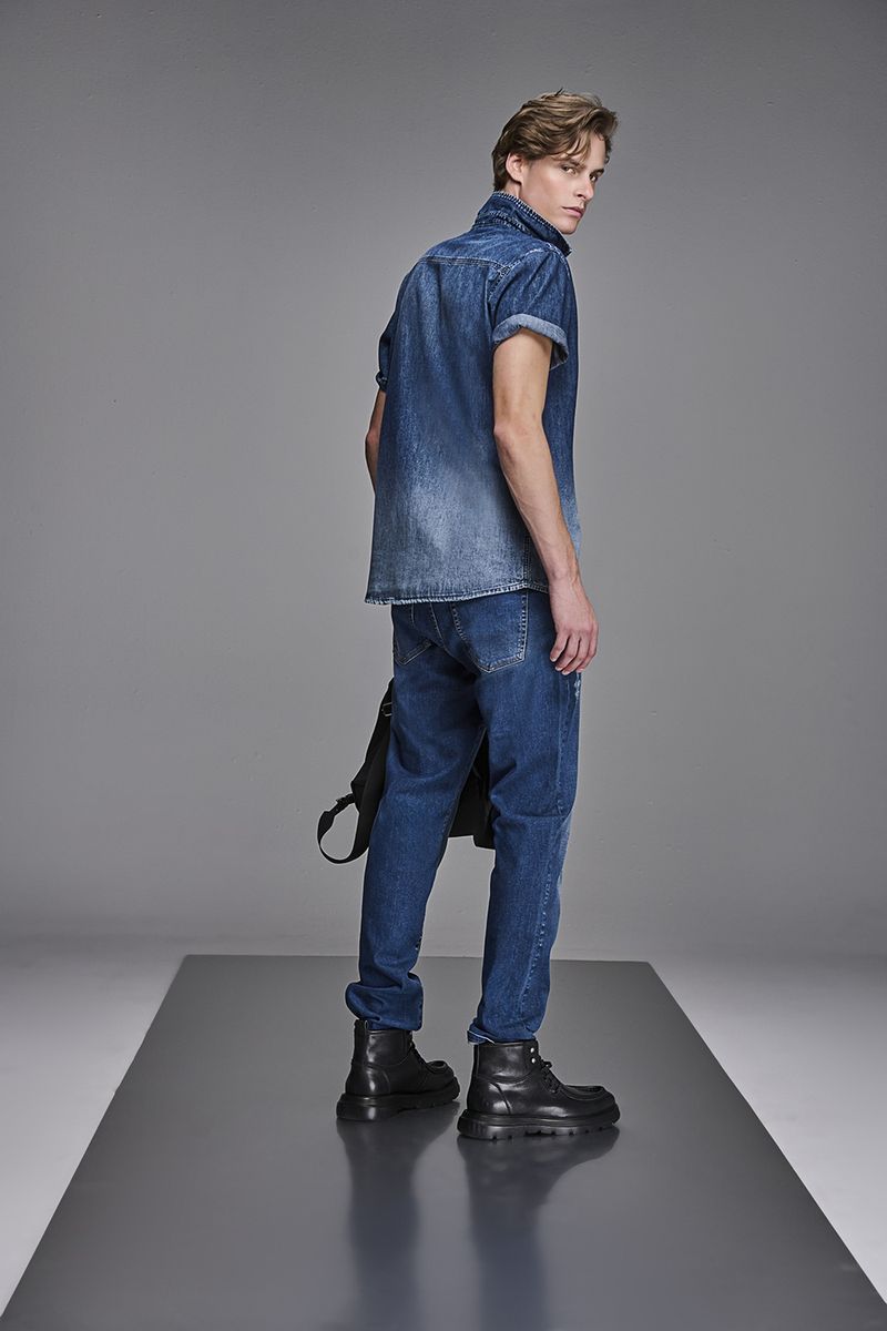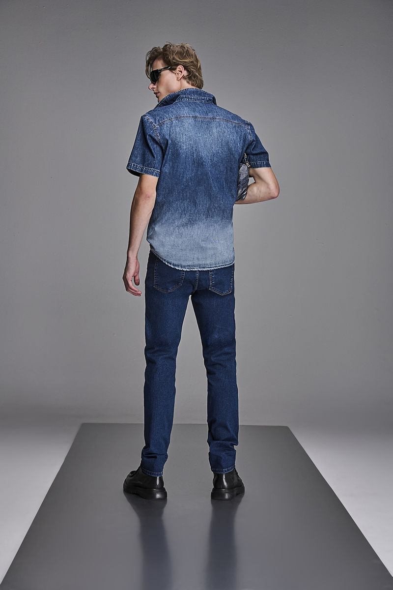 Calça skinny masculina Patogê em jeans de algodão com poliéster e elastano proporcionando conforto durante o uso. Bolsos frontais tradicionais, bolsos posteriores, cós com passantes e fechamento frontal por zíper e botão. Lavanderia escura com marcação de costura.