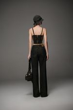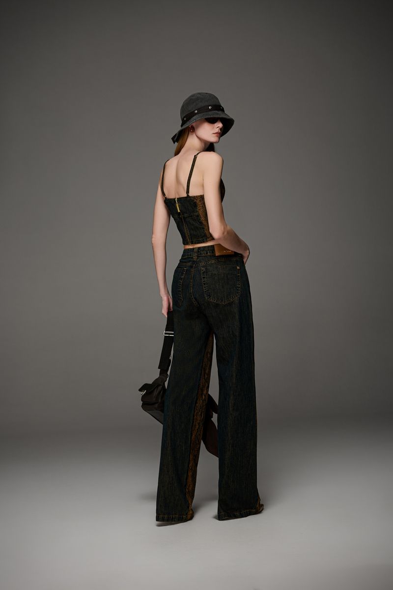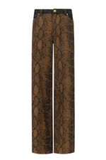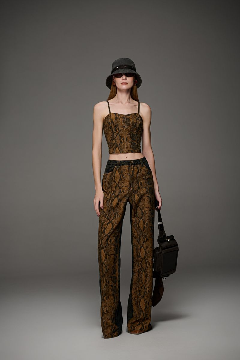 Calça wide leg feminina Patogê em jeans 100% algodão. Peça diferenciada confeccionada com jaquard denim em print de cobra conferindo personalidade e informação de moda a qualquer produção da temporada. Bolsos frontais tradicionais, bolsos posteriores, cós com passantes e fechamento por zíper e botão. Lavanderia escura com sobretingimento conferindo exclusividade a peça. Opção de conjunto: TP39743.A modelo da foto veste tamanho 38Medidas da modelo: Altura 1,74m Busto 88cm Cintura 65cm Quadril 99cm