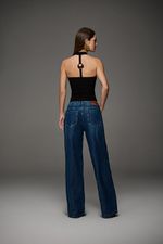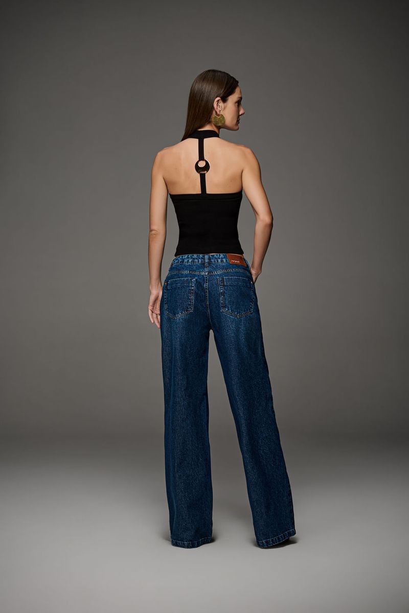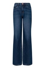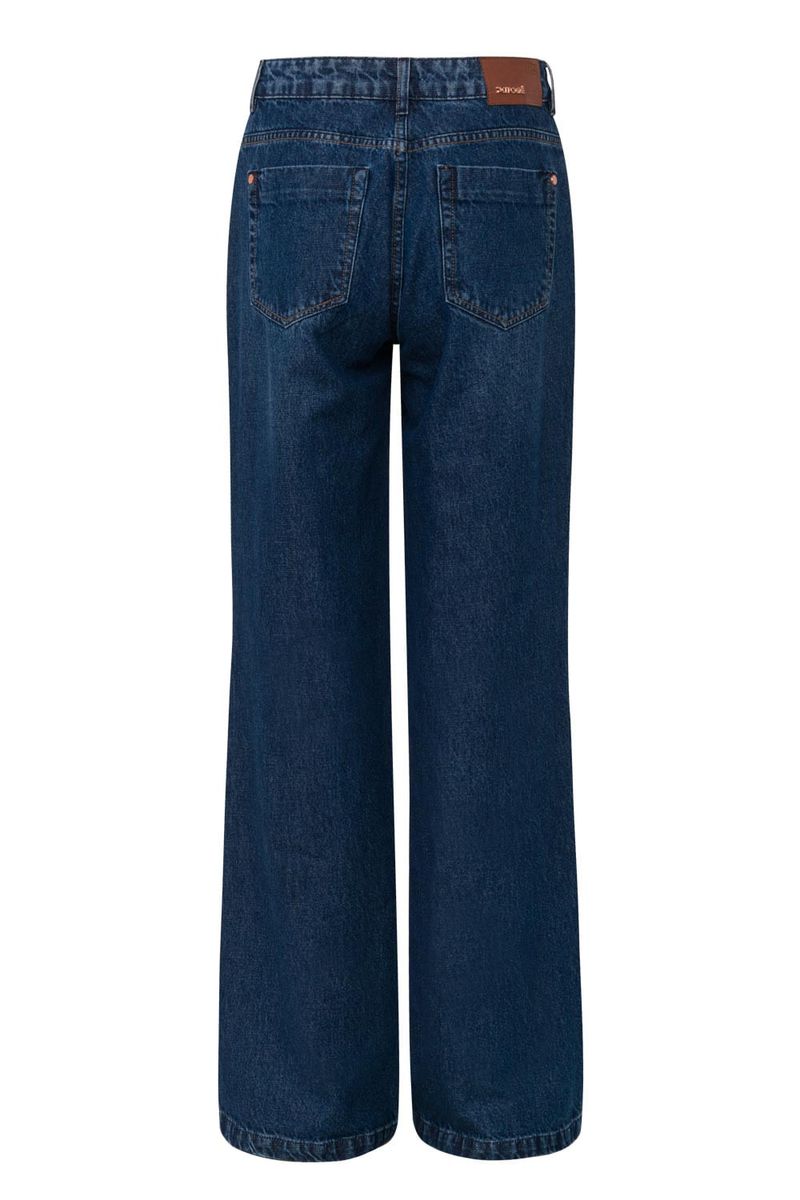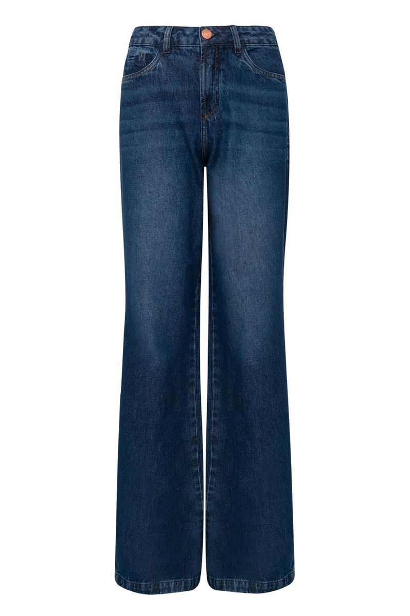 Calça wide leg feminina Patogê em jeans 100% algodão. Modelo da linha clássica conta com bolsos frontais tradicionais, bolsos posteriores, cós com passantes e fechamento por zíper e botão. Lavanderia média para escura stonada com marcação de costura. A modelo da foto veste tamanho 38. Medidas da modelo: Altura 1,74m Busto 88cm Cintura 65cm Quadril 99cm