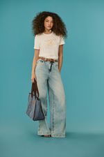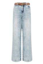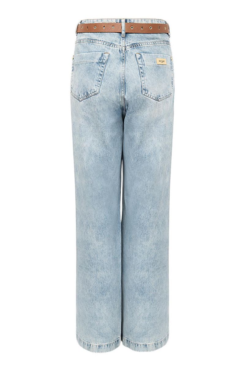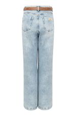 Calça wide leg over feminina Patogê em jeans 100% algodão. Bolsos frontais, bolsos posteriores, pespontos laterais, cós com passantes e fechamento por zíper e botão. Acompanha cinto em tom coringa para compor vários produções. Lavanderia clara marmorizada com marcação de costura.