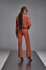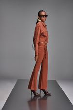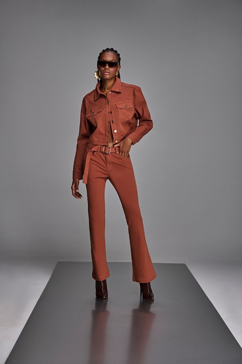 Calça flare G4 feminina Patogê em sarja de algodão com elastano proporcionando conforto durante o uso. Cinto do próprio tecido com fivela de metal personalizada, pesponto duplo lateral, bolsos posteriores, cós com passantes e fechamento frontal por zíper e botão. Duas opções de cor. Conjunto com JQ38637.