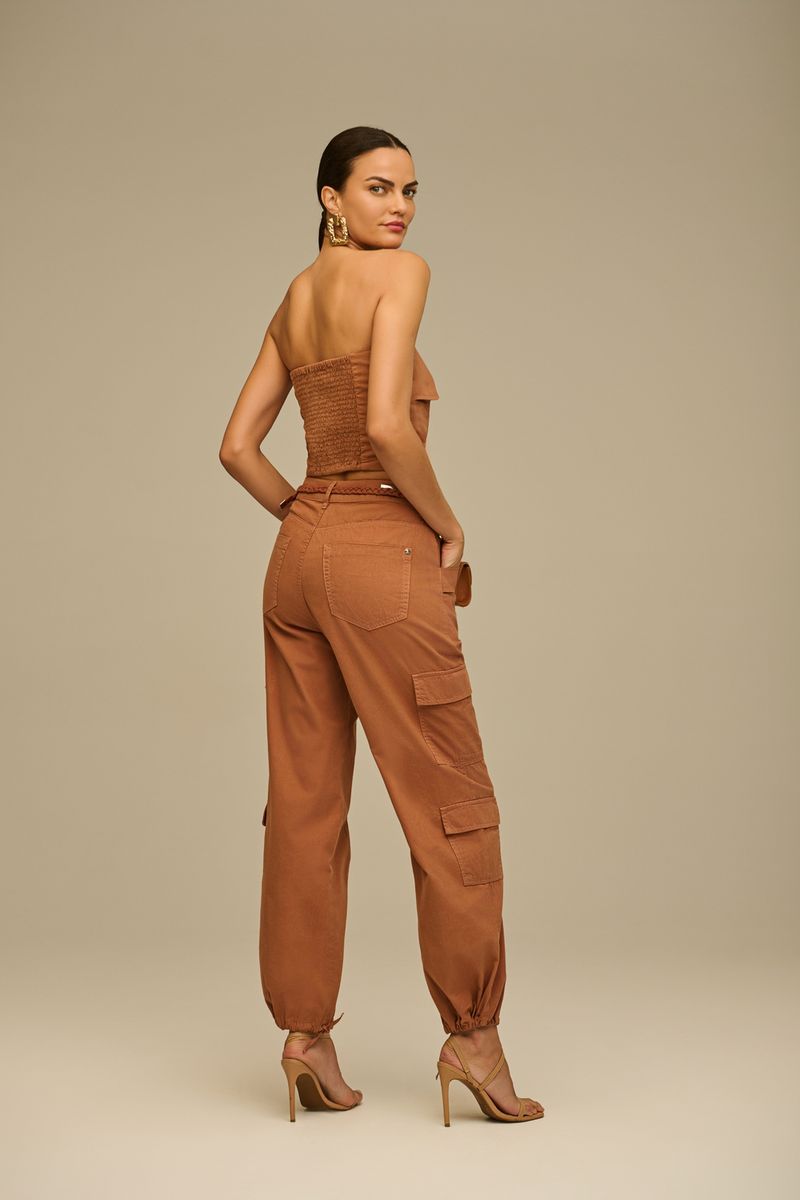 Calça jogger feminina Patogê em sarja 100% algodão. Bolso frontal embutido, bolsos laterais e recorte que conferem à peça um ar esportivo e despojado. Bolsos posteriores, barras reguláveis com rolotê do próprio tecido, cós com passantes e fechamento por zíper e botão. Lavanderia com tingimento e duas opções de cor. Opção de conjunto: TP39129.