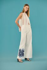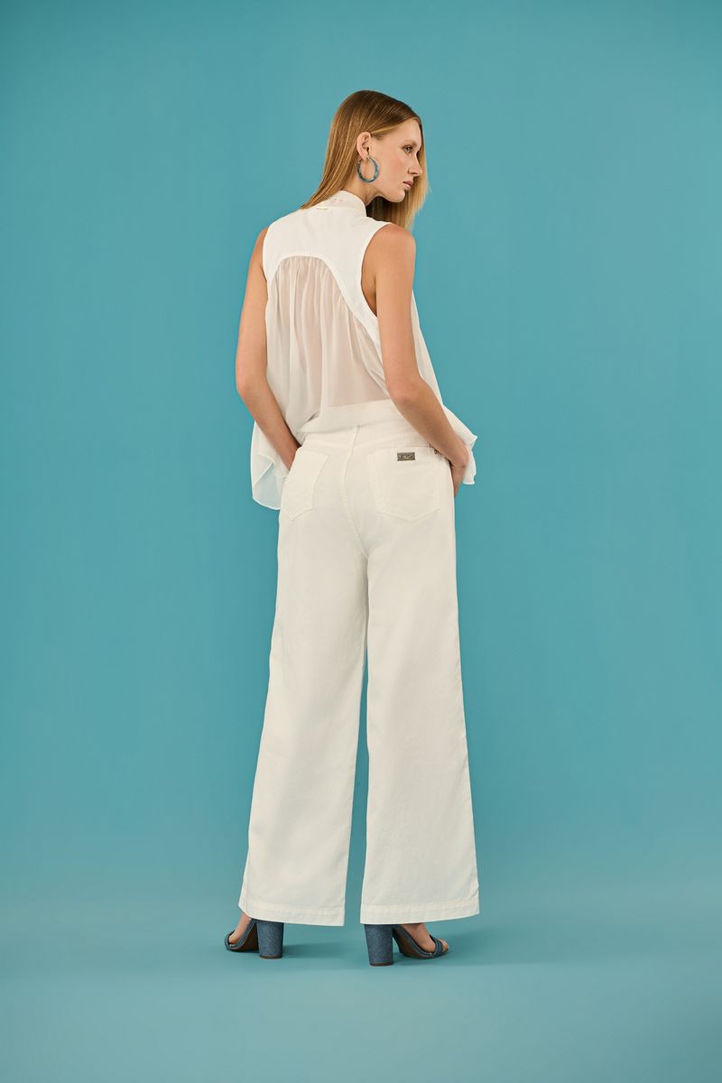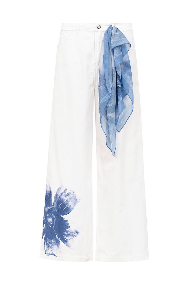 Calça pantalona feminina Patogê em sarja 100% algodão. A atemporal estampa floral ganha novos ares incorporada à especiais peças de forma localizada e com efeito aquarela. Bolsos frontais, bolsos posteriores, cós com passantes e fechamento por zíper e botão. Acompanha lenço com a estampa possibilitando composições aos looks da temporada. Peça amaciada em processos de lavanderia. Peças da mesma família: BL39411, SH39412, CA39414.