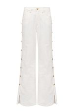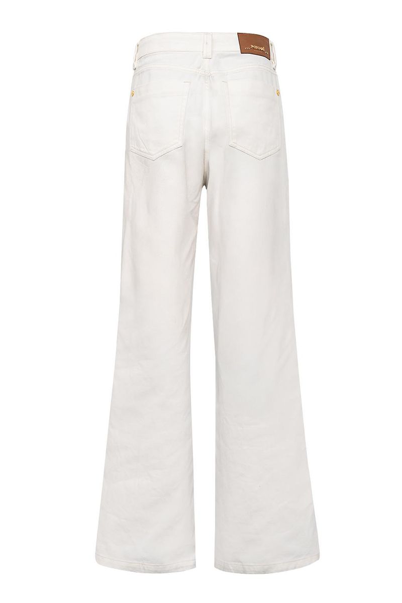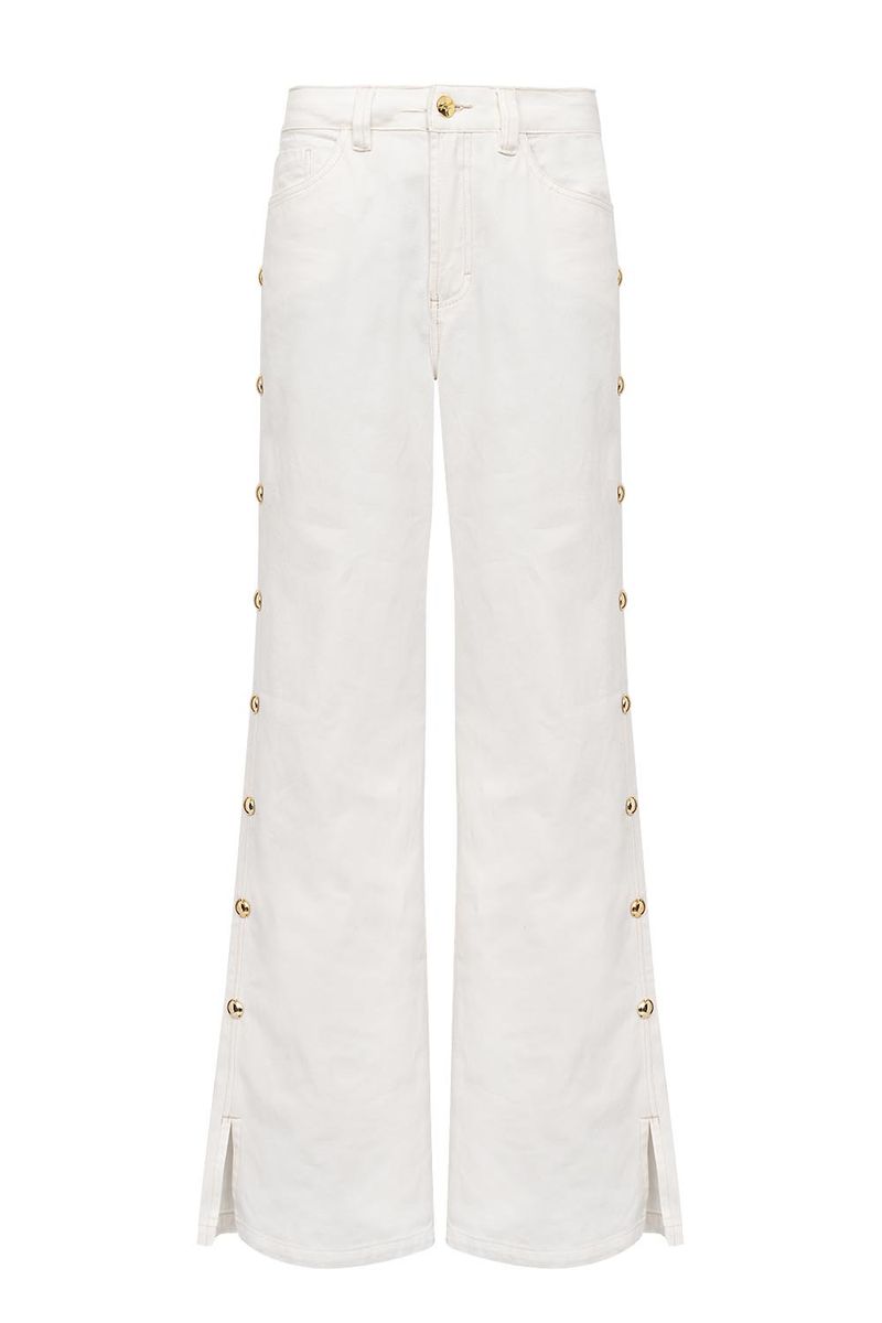 Calça wide leg feminina Patogê em sarja 100% algodão. Rico detalhe de bordado manual nas laterais com metal esférico que evoca um dos elementos chave da coleção. Bolsos frontais, bolsos posteriores, cós com passantes e fechamento por zíper e botão. Peça amaciada em processos de lavanderia.