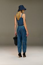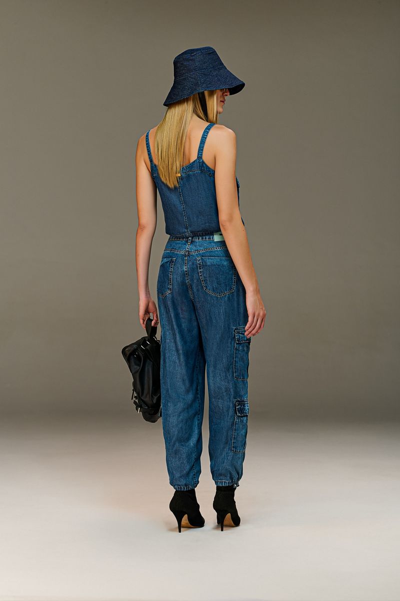 Calça slouchy feminina Patogê em jeans 100% liocel. Bolsos laterais utilitários que conferem ar esportivo ao look. Bolsos frontais, bolsos posteriores, barra ajustável com rolotê do próprio tecido, cós com passantes e fechamento por zíper e botão. Lavanderia média para escura com marmorizado e marcação de costura.