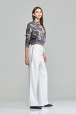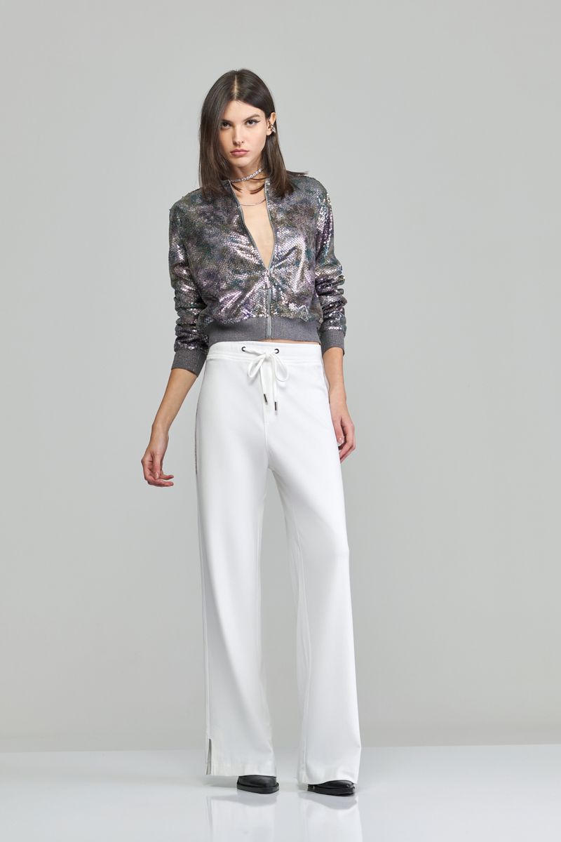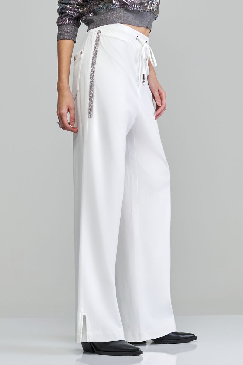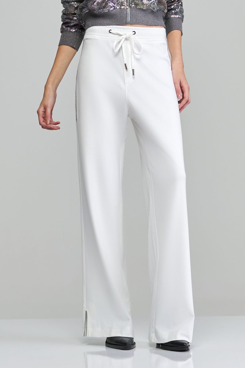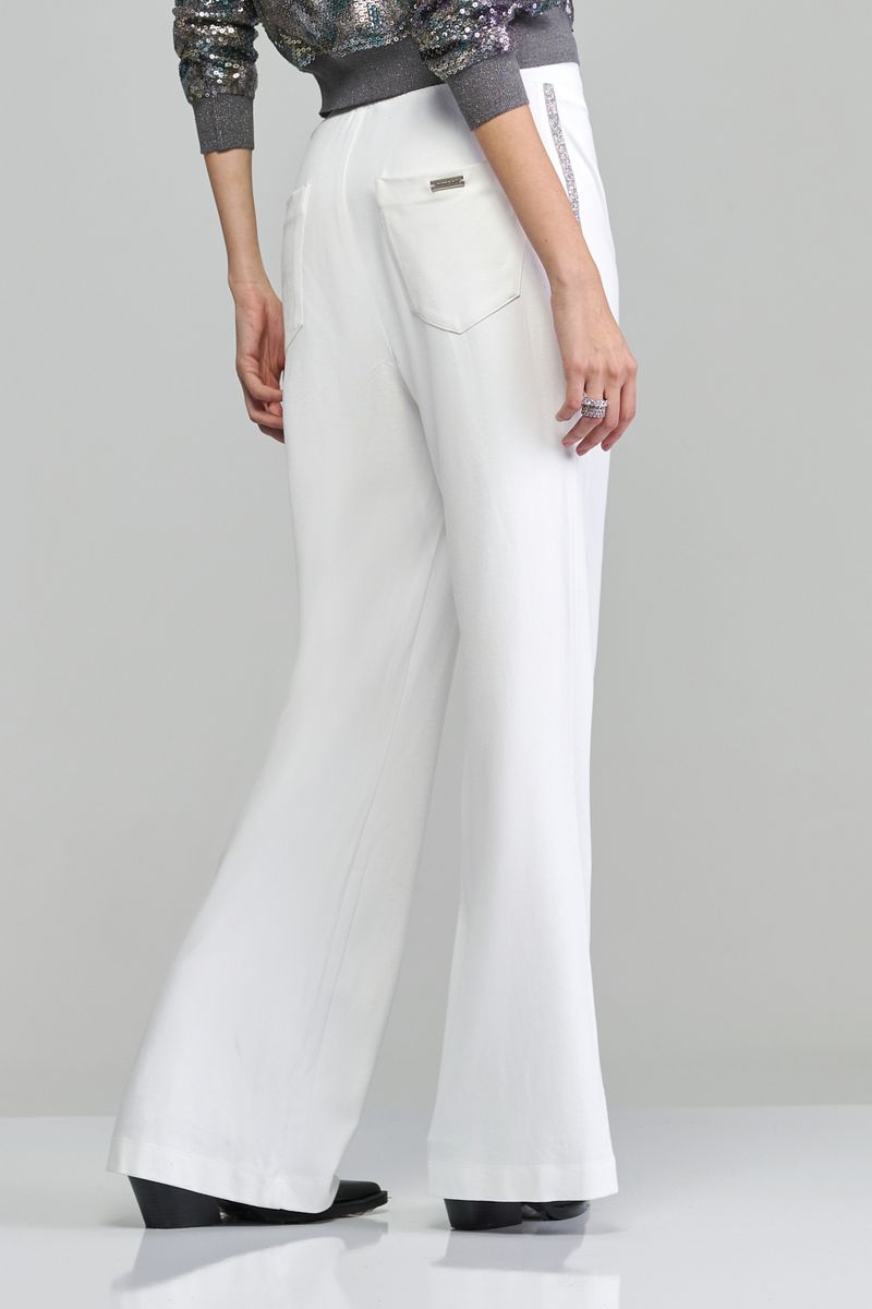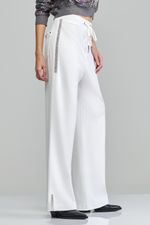 Calça Patogê feminina wide leg confeccionado em tecido de algodão e elastano. Cós de elástico, cadarço do próprio tecido com ponteira de níquel, ilhós black Diamond, bolsos posteriores e fenda lateral. Duas opções de cor.