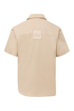 Camisa feminina Patogê em tecido 100% algodão. Modelo clássico do vestuário que ganha toque de autenticidade e modernidade nessa coleção. Fenda assimétrica unilateral, gola tradicional com cantoneiras metálicas personalizadas, maxi etiqueta posterior, mangas curtas e fechamento por abotoamento. Duas opções de cores. A modelo da foto veste tamanho 38. Medidas da modelo: Altura 1,74m Busto 88cm Cintura 65cm Quadril 99cm.