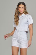 Camisa Patogê feminina em sarja 100% algodão. Detalhe de desgaste feito em laser com bordado manual, recortes frontais e posterior, bolsos frontais quadrados, mangas curtas, gola tradicional e fechamento frontal por botões.
