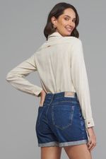 Camisa Patogê feminina em tecido plano. Gola clássica, manga longa, punho com abotoamento, bolsos frontais com tampa e fecho frontal por botões.