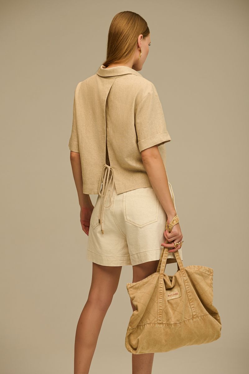 Camisa feminina Patogê confeccionada em tecido de linho com viscose. Detalhe de transpasse nas costas com rolotê do próprio tecido para amarrar. Gola tradicional e fechamento frontal por abotoamento. Duas opções de cor.