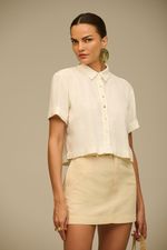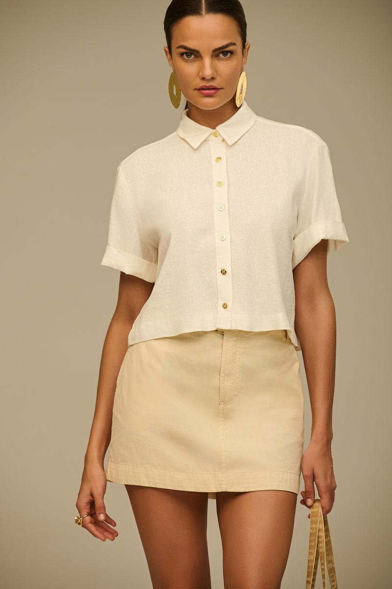 Camisa feminina Patogê confeccionada em tecido de linho com viscose. Detalhe de transpasse nas costas com rolotê do próprio tecido para amarrar. Gola tradicional e fechamento frontal por abotoamento. Duas opções de cor.