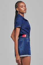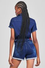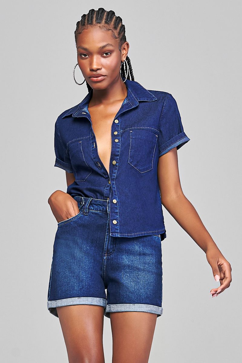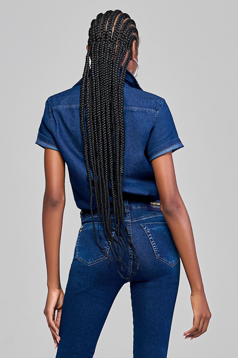 Camisa Patogê feminina em jeans de algodão com elastano e poliéster, proporcionando conforto durante o uso. Recortes frontais e posterior, bolsos frontais, mangas curtas, assimetria na barra, gola tradicional e fechamento frontal por botões. Lavanderia escura com marcação de costura.