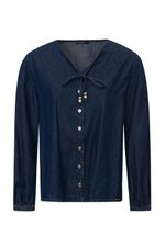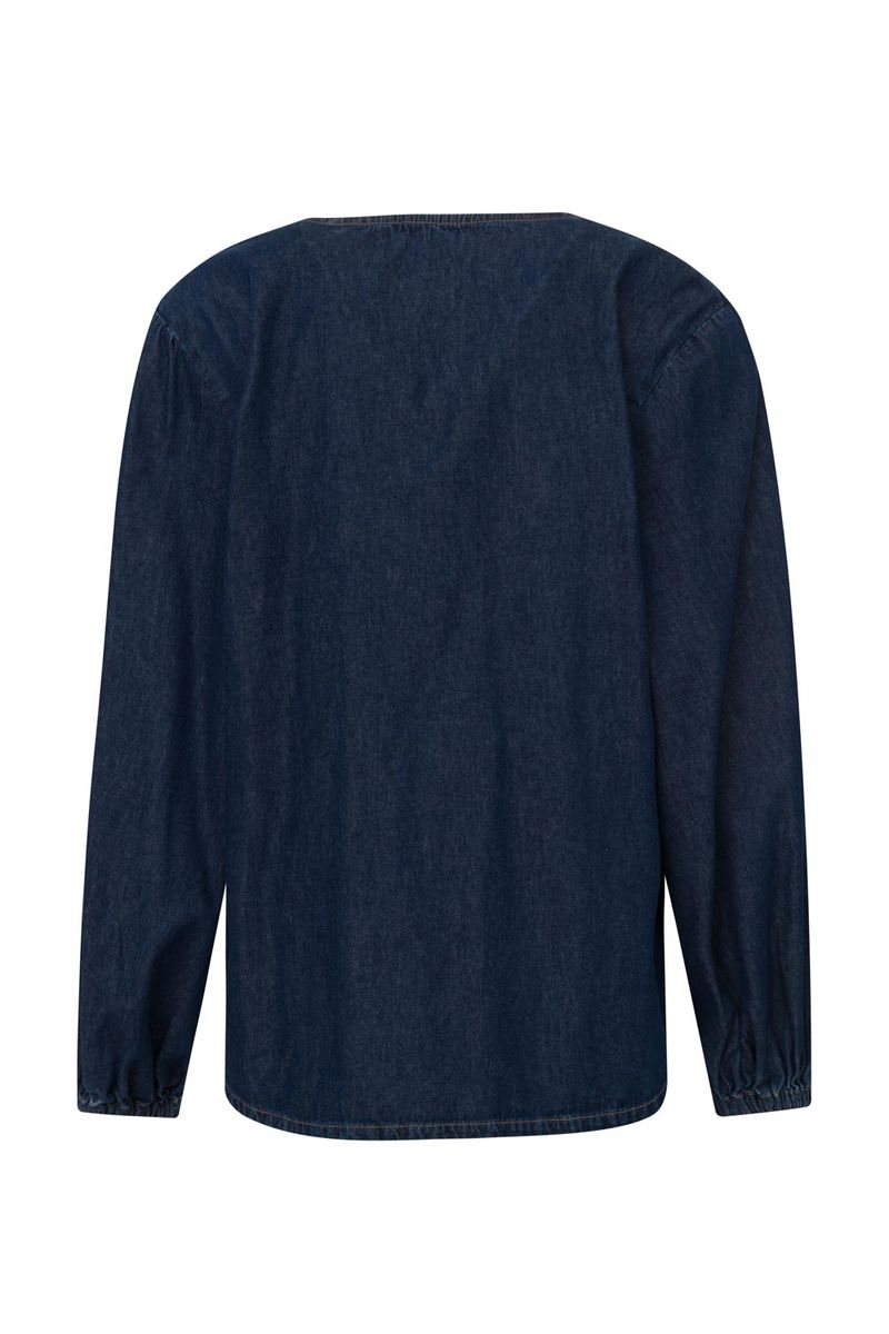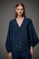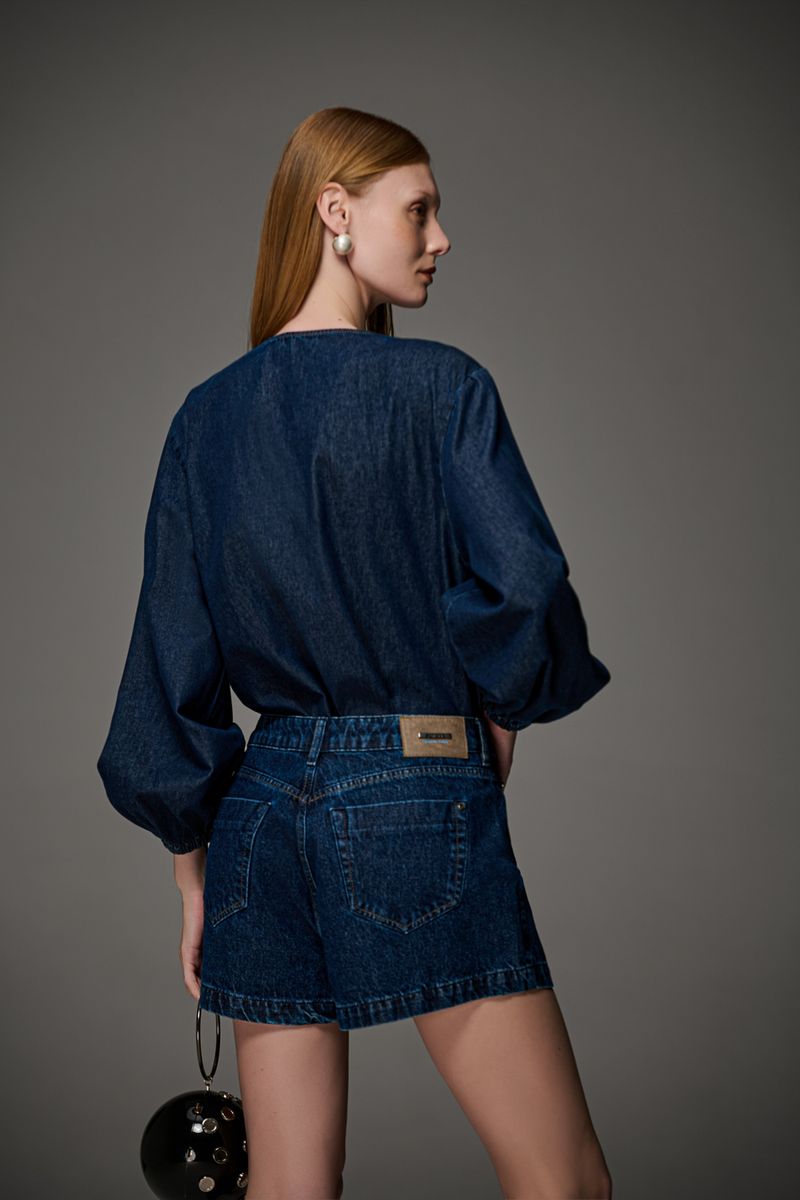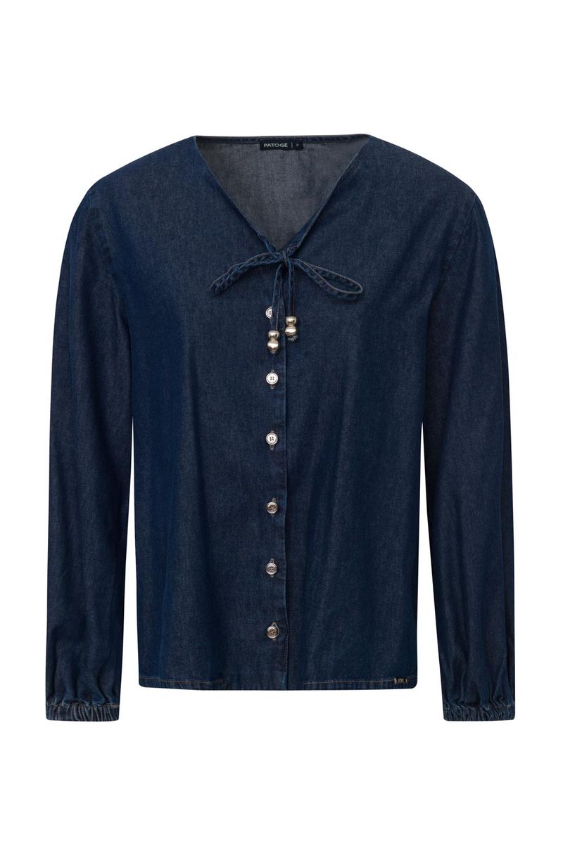 Camisa feminina Patogê em jeans de gramatura leve 100% algodão. Mangas volumosas com elástico nos punhos que conferem feminilidade a peça, decote em v e fechamento por abotoamento. Lavanderia escura com marcação de costura. A modelo da foto veste tamanho 38. Medidas da modelo: Altura 1,74m Busto 88cm Cintura 65cm Quadril 99cm