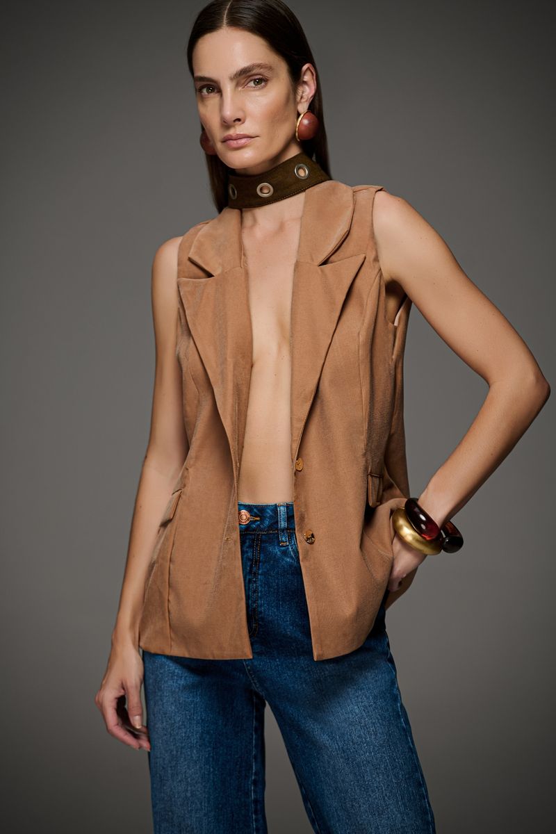 Modelo veste colete preto.