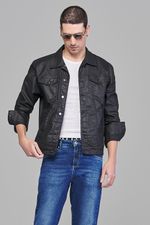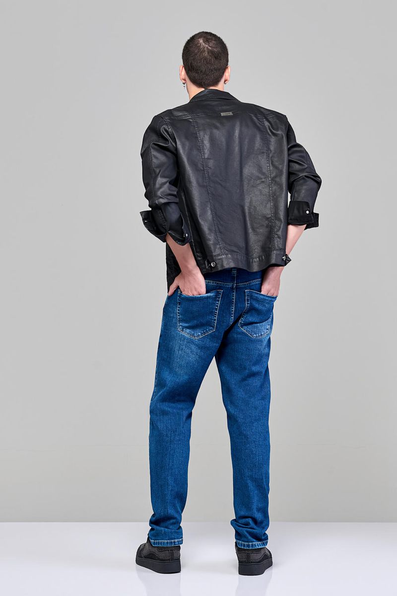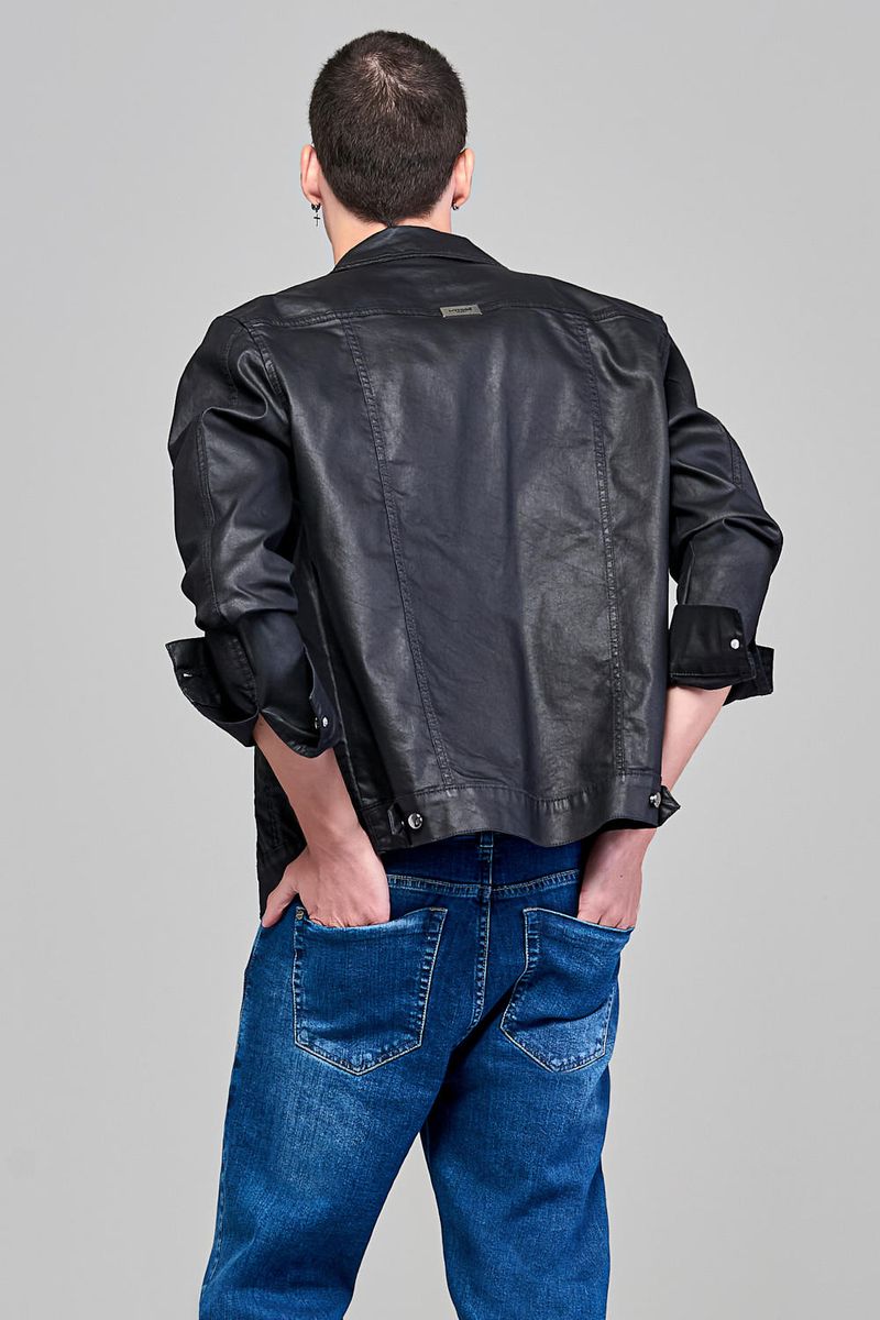 Jaqueta Patogê masculina em jeans resinado de algodão com elastano e poliéster, proporcionando conforto durante o uso. Recortes frontais e posteriores, gola tradicional, bolsos laterais, mangas longas com botões nos punhos e fechamento frontal por abotoamento.