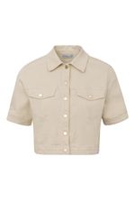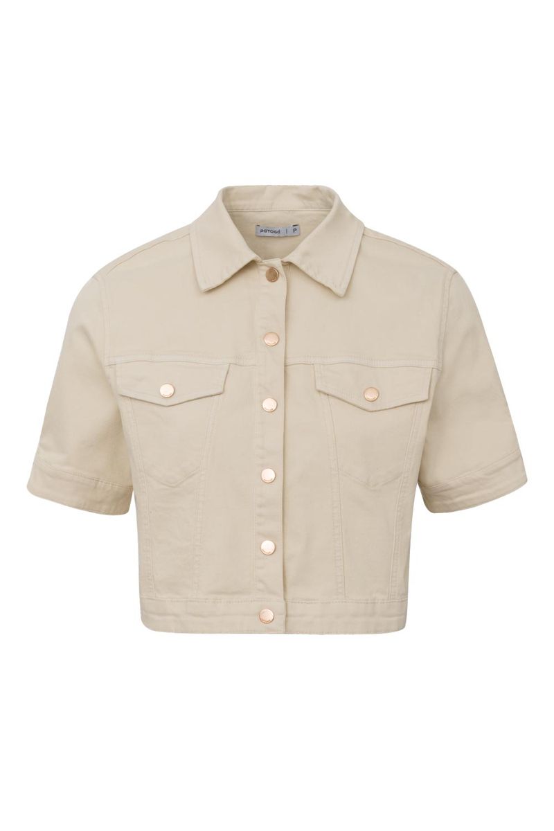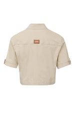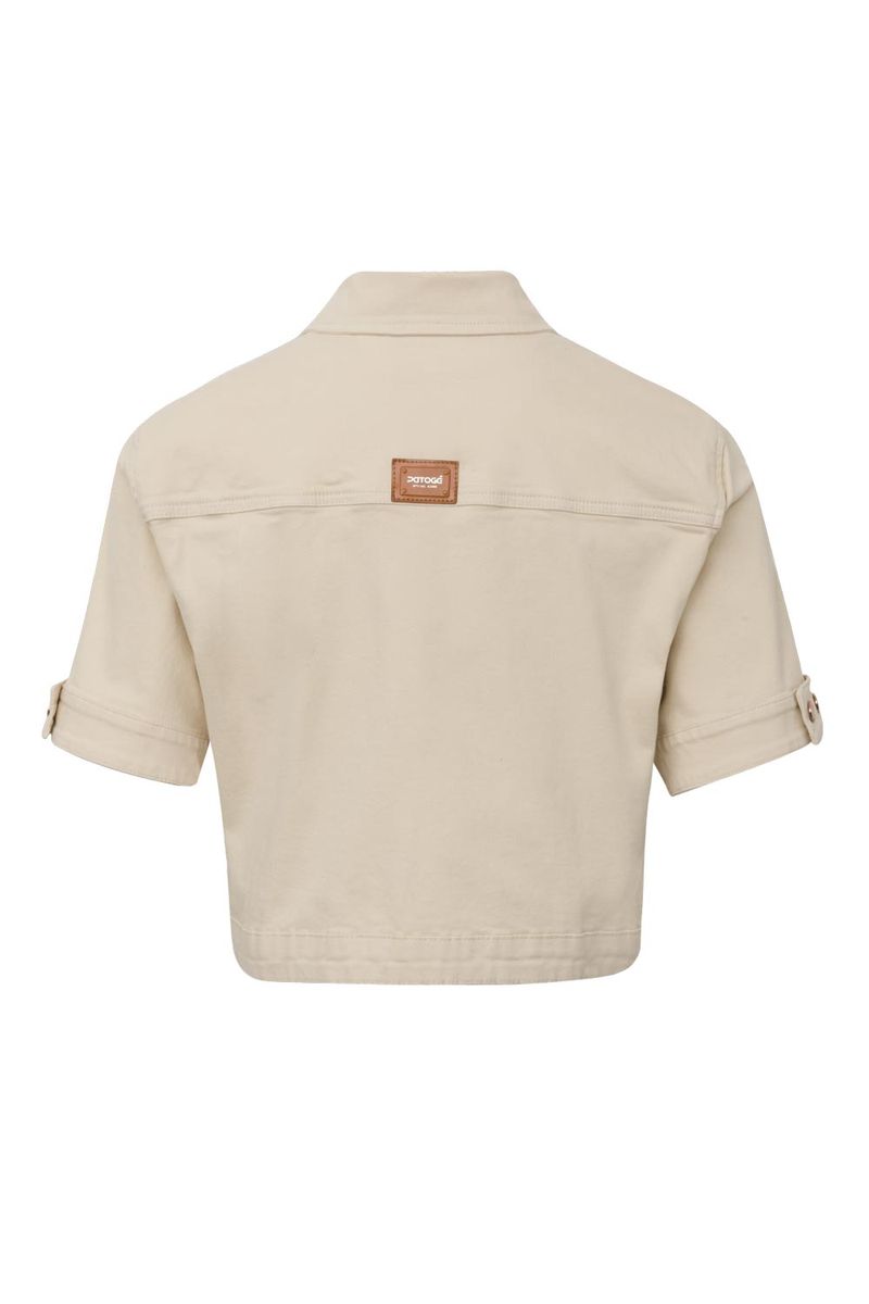 Jaqueta feminina Patogê em sarja de algodão com elastano proporcionando conforto durante o uso. Modelo versátil que permite produções casuais de forma individual ou como terceira peça. Bolsos frontais funcionas, gola tradicional, mangas curtas e fechamento por abotoamento. Peça tingida em processos de lavanderia. Duas opções de cores. Opção de conjunto: CL39828. A modelo da foto veste tamanho 38. Medidas da modelo: Altura 1,74m Busto 88cm Cintura 65cm Quadril 99cm