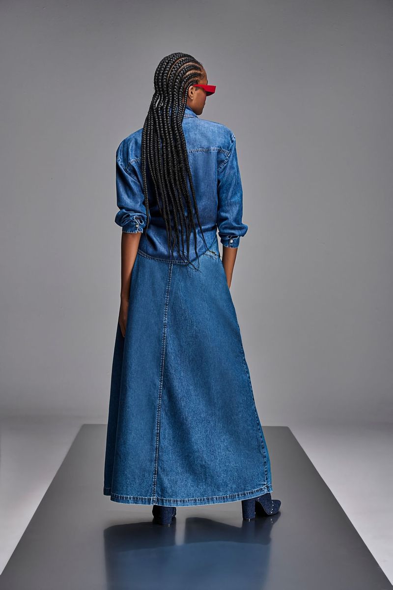 Saia longa feminina Patogê em jeans 100% algodão. Bolsos frontais estilo faca, bolsos posteriores embutidos falsos e fechamento frontal por abotoamento. Lavanderia média para escura com marcação de costura.