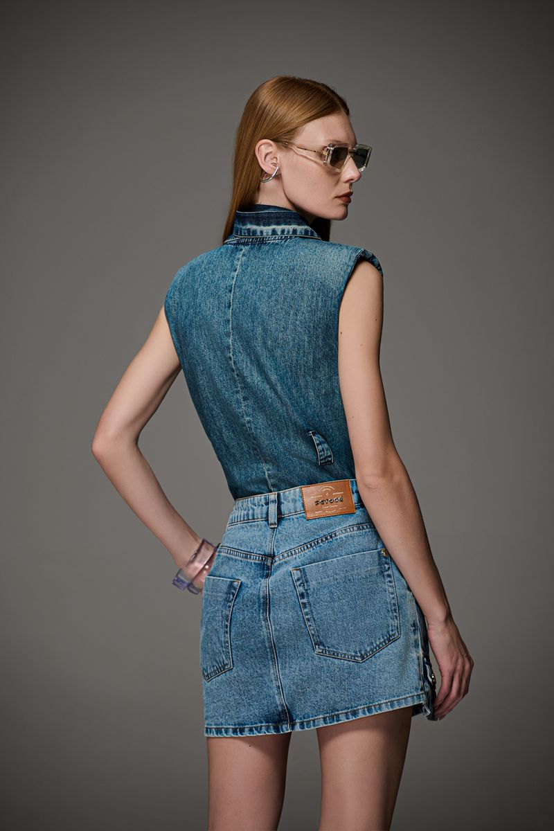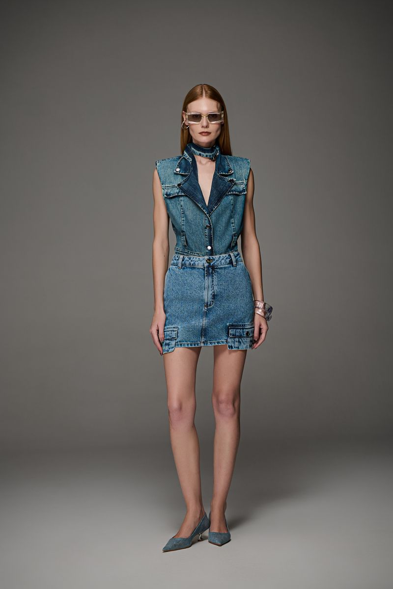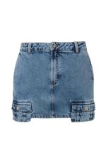 Mini saia feminina Patogê em jeans 100% algodão. Peça despojada com toque utilitário para as produções mais casuais da temporada. Bolsos pendentes com abotoamento funcional, bolsos frontais estilo faca, bolsos posteriores, cós com passantes e fechamento por zíper e botão. Lavanderia clara marmorizada com marcação de costura. A modelo da foto veste tamanho 38. Medidas da modelo: Altura 1,74m Busto 88cm Cintura 65cm Quadril 99cm