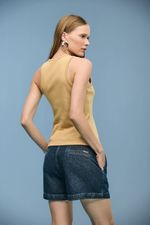 Short mom feminino Patogê em jeans 100% algodão. Modelagem estiloalfaiataria chique com bolsos laterais, bolsos posteriores embutidos falsos, recortes, cós com passantes e fechamento por zíper e botão. Lavanderia escura stonada com marcação de costura.
