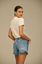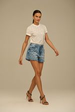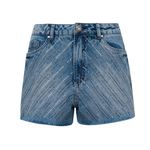 Short oversized feminino Patogê em jeans 100% algodão. Rico detalhe frontal em contas brilhantes feito em técnica de transfer. Bolsos frontais, bolsos traseiros, barras à fio, cós com passantes e fechamento por zíper e botão. Lavanderia clara marmorizada com leves puídos e marcação de costura. Peça da mesma família: TS39284.