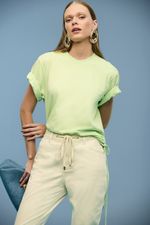 T-shirt feminina Patogê confeccionada em malha 100% algodão. Modelagem confortável, detalhe lateral com franzido feito com rolotê do próprio tecido, mangas amplas e gola em ribana. Duas opções de cor.