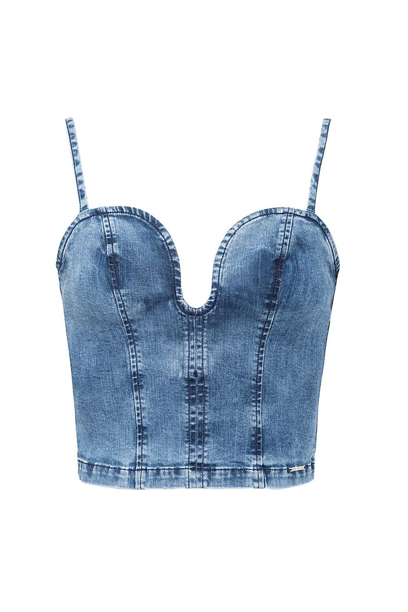 Top feminino Patogê em jeans de algodão com elastano proporcionando conforto durante o uso. Decote arredondado com estrutura interna, alças reguláveis, recortes que valorizam o corpo e fechamento posterior por zíper destacável. Lavanderia média marmorizada com marcação de costura. Peça da mesma família: VE39326.A modelo da foto veste tamanho 36.Medidas da modelo: Altura 1,75m Busto 84cm Cintura 63cm Quadril 90cmESPECIFICAÇÕES: Modelagem: Top Tecido: Jeans Composição: 97% algodão 3% elastano Lavanderia: Média Gênero: Feminino Referência: TP39325 851939325Dica: Para prolongar a vida das suas peças de roupa, laveas sempre a baixas temperaturas e do avesso, desta forma ajuda a preservar as cores e a estrutura do tecido e reduz o consumo de energia.