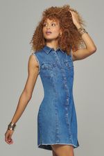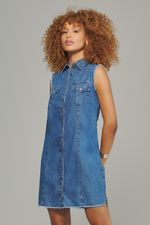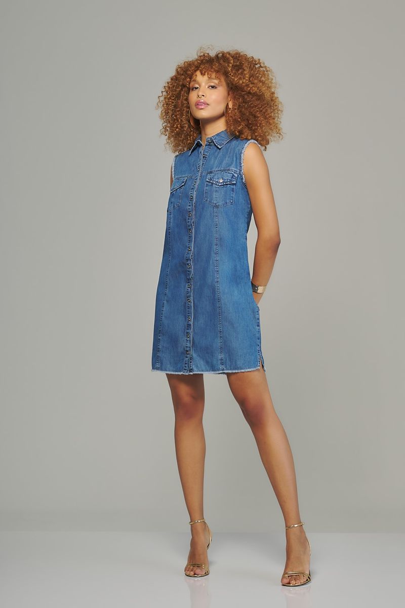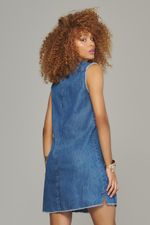 Vestido Patogê feminino curto em jeans leve sem elastano. Fechamento por botões, bolsos e recortes frontais, com barra e manga à fio. Lavanderia média com marcação de costura.