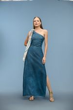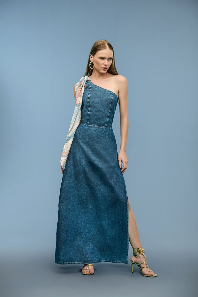 Vestido longo feminino Patogê em jeans 100% algodão. Decote ombro só com lenço da estampa exclusiva, fenda frontal e fechamento lateral por zíper. Lavanderia média marmorizada com marcação de costura. Peças da mesma família: BL39159, CL39160, VE39289, AC39422 e BL39288.