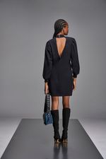 Vestido feminino Patogê em moletom de algodão com poliéster. Elegante decote que valoriza as costas, detalhe de pregas nas mangas conferindo leve volume, fechamento posterior no pescoço por botões, gola e punhos em ribana. Duas opções de cor.