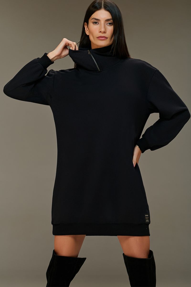 Vestido feminino Patogê em moletom de algodão com póliéster. Gola estilo rolê com fechamento por zíper e cava levemente deslocada. Punhos e barra em ribana. Duas opções de cor.